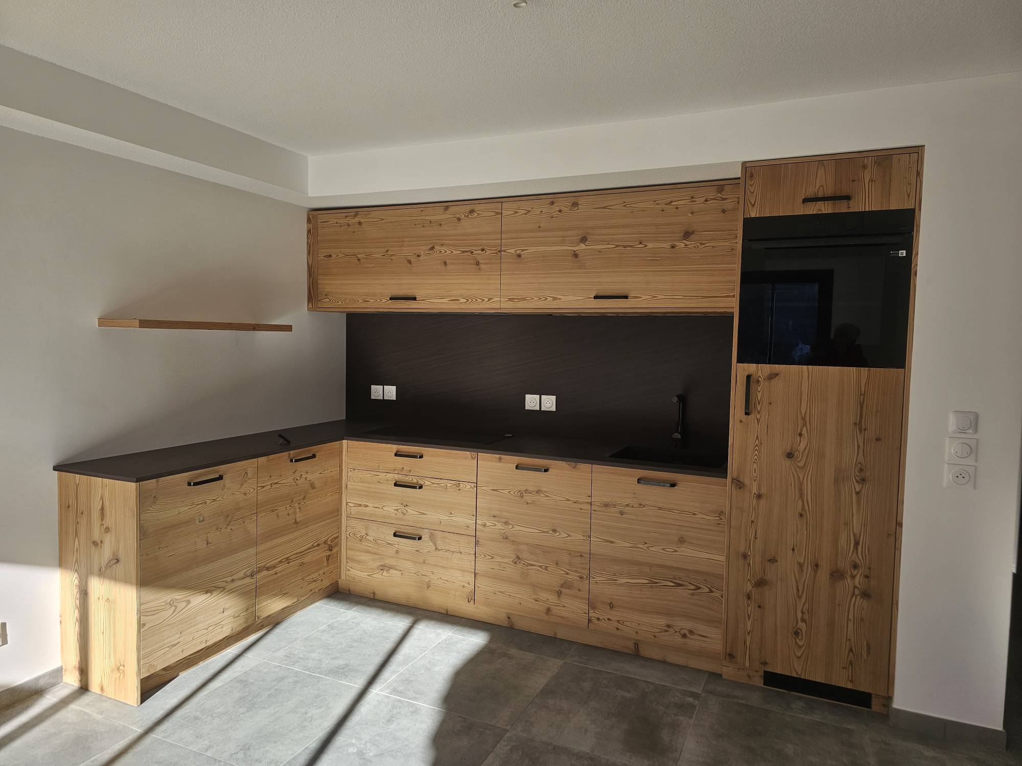 Cuisine en mélèze vapo brossé finition vernis mate.