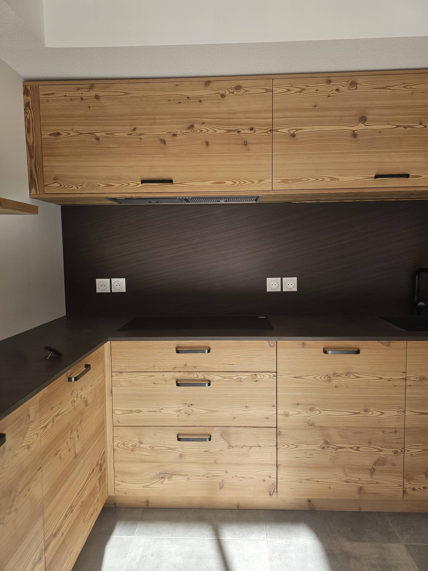 Cuisine en mélèze vapo brossé finition vernis mate.